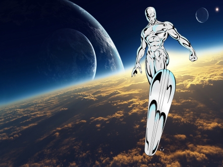 Silver Surfer, una volta diventato l’araldo di Galactus, riceve in dono i Poteri Cosmici che gli modificano l’aspetto fisico, trasformandolo in un umanoide argentato dotato di una tavola da surf,anch’essa argentata, che gli permette di viaggiare più veloce della luce.