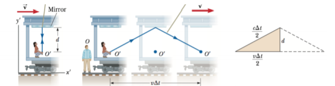 Analizziamo un attimo la figura sovrastante. La persona dentro al treno, figura a sinistra, definita nel sistema O’, il tempo impiegato dalla luce per andare e tornare alla sorgente. Esso sarà pari a 2d/c.
