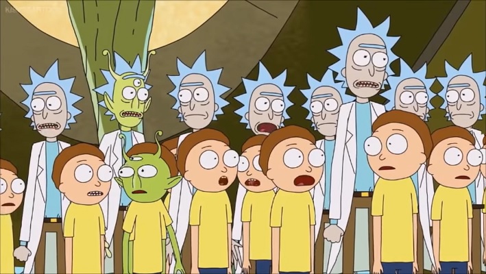L’idea principale dietro alla teoria del Multiverso risiede nella esistenza di universi paralleli al nostro, ma le descrizioni di come essi interagiscano tra loro o nascano sono numerose e diverse una dall’altra. Secondo la teoria quantistica, e in particolare l’Interpretazione a Molti Mondi, ogni evento con più di un esito possibile crea un numero di realtà alternative pari al numero degli esiti stessi. Per esempio, il lancio di una moneta creerà un universo in cui l’esito è testa e un altro in cui invece il risultato è croce. Analizzato invece dalla cosmologia moderna, il concetto di Multiverso risulta più sofisticato e viene descritto dalla teoria dell’inflazione cosmica, la quale immagina (in maniera decisamente curiosa) lo spazio-tempo come un pezzo di pane nel processo di lievitazione: universi individuali si formano e crescono, e alcuni di essi si dilatano all’infinito. All’interno della serie tv, ogni dimensione alternativa presenta delle variazioni notevoli o trascurabili rispetto alle altre, ma il modello di base rimane più o meno lo stesso, seppur con qualche curiosa eccezione ( la più esilarante è sicuramente l’universo dei frullatori il cui accesso è, per motivi abbastanza ovvi, fortemente sconsigliato ). Secondo il canone narrativo, l’universo dove Rick e Morty vivono attualmente sarebbe una versione apparentemente identica dell’universo originale C-137, dal quale i nostri eroi sono scappati per evitare l’invasione dei terrificanti Cronenbergs, creature la cui bruttezza e mostruosità ricorda gli orrori di Lovecraft.