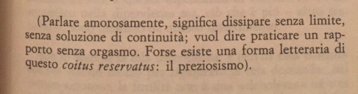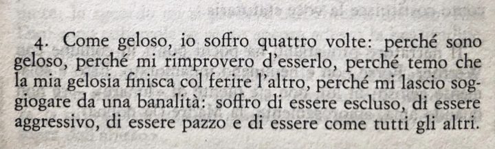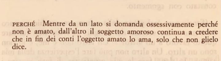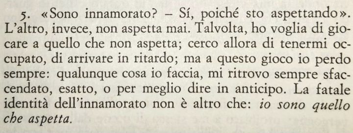 “Io ti amo” – “Ti amo anche io”. Il finale perfetto per una storia ispirata ad una pellicola woody-alleniana. E così, si fa strada un mutamento nella relazione, una rivoluzione. Si catalizza un meccanismo dialettico per cui l’io-ti-amo viene finalmente pronunciato con la speranza, al limite dell’aspettativa, di essere contraccambiato. L’io lo considera un’esperienza al pari del sesso con gli angeli, dopo aver sentito quella dodecafonica parola magica. Ma non desidera solo sentirsi amato a sua volta e ben sicuro di questo. Desidera, anzi, di sentirselo dire con quella stessa formula, senza alcuna variazione sintattica o scappatoia, con lo stesso significante per quel significato. Un amico di Barthes, Gilles Deleuze, parlava di concatenamento, cioé desiderare è la summa di altri desideri, concatenati tra loro. Ad esempio, io non voglio solo che tu mi dica che mi ami. Io voglio che tu me lo dica portandomi nel mio posto preferito, prendendomi per la mano, regalandomi un mazzo di tulipani (quelli colorati che mi piacciono tanto), facendomi scegliere la musica da mettere in macchina al ritorno. Così, tanto se dovessi immaginare una situazione tipo, capito? Gilles Deleuze aveva forse aiutato il suo amico Barthes. Forse, gli aveva fatto capire che le ragazze, quando dicono di non avere nulla, in realtà, sono ad un passo dal concretizzare un regime di Terrore degno di Robespierre o Hitler, mentre in sottofondo ascoltano Gazzelle: Non mi chiedi mai veramente come sto, come vuoi che sto? Non lo so nemmeno io, boh.