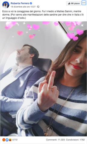 Una storia Instagram che nelle ultime 24 ore ha suscitato un clamore mediatico senza precedenti. È quanto accaduto ad Erika Labbe, giovane 19enne fuorisede di Conversano, che è divenuta celebre per lo scatto pubblicato il pomeriggio del 18 dicembre su Facebook e Instagram, nella quale ritrae lei in primo piano col dito medio accanto a Matteo Salvini addormentato sul sedile di un aereo con tanto di filtro con cuoricini. Una fotografia divenuta, in poche ore, virale, che ha diviso il web tra chi ha apprezzato e chi, invece, l’ha ricoperta da una valanga di insulti. A mettere alla gogna la giovane ci ha pensato Roberta Ferrero, senatrice leghista, che ha commentato su Facebook la foto della ragazza: “Ecco a voi la coraggiosa del giorno. Fa il medio a Matteo Salvini, mentre dorme. Poi però vanno alle manifestazioni delle sardine per dire che in Italia c’è un linguaggio d’odio.”