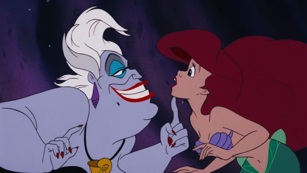 Ne ‘La Sirenetta’ infatti ci imbattiamo nuovamente nel tema del doppio creato da Plauto. Vi starete chiedendo come sia possibile un collegamento simile, eppure basta pensare alla seconda metà del cartoon per scovare la risposta. Infatti, è proprio da questo momento in poi che entra in scena la tanto odiata Ursula, la malvagia antagonista del racconto, che cercherà in tutti i modi di sabotare l’adolescente e inesperta Ariel. Quest’ultima è una giovane sirena che, innamoratasi del principe Eric, un umano, disperata perché non può conquistare il suo amato, cade nel tranello di Ursula, la quale dona gentilmente ad Ariel aiuto e conforto, le promette di trasformarla in umana, così da poter conquistare il suo principe, richiedendole però in cambio la sua magnifica voce. Ariel accetta… non l’avesse mai fatto.