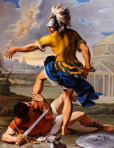 L’integrazione nella regione, però, non è semplice: dopo aver instaurato buoni rapporti con il re di Laurento, Latino, ottenendo anche la mano della figlia Lavinia, Enea deve far fronte all’inimicizia degli altri popoli italici. Più in particolare è Turno, re dei Rutuli, il primo a rifiutare l’arrivo dello straniero: d’altronde, prima che giungesse, Lavinia gli era stata promessa in sposa, salvo poi essere destinata al troiano in nome del volere divino. Scoppia quindi un sanguinoso conflitto tra le parti, in cui sono moltissimi gli eroi a perdere la vita. Emblematica è però la morte di tantissimi e valorosi giovani: Camilla, Lauso, Eurialo e l’amico Niso, e, soprattutto, Pallante, figlio di Evandro, re degli Arcadi, popolo di origine greca schierato con Enea. La fine del principe arriva quando sulla sua strada si staglia Turno, contro il quale nulla possono la freschezza e l’entusiasmo di un ragazzo. Così l’episodio è descritto da Virgilio: