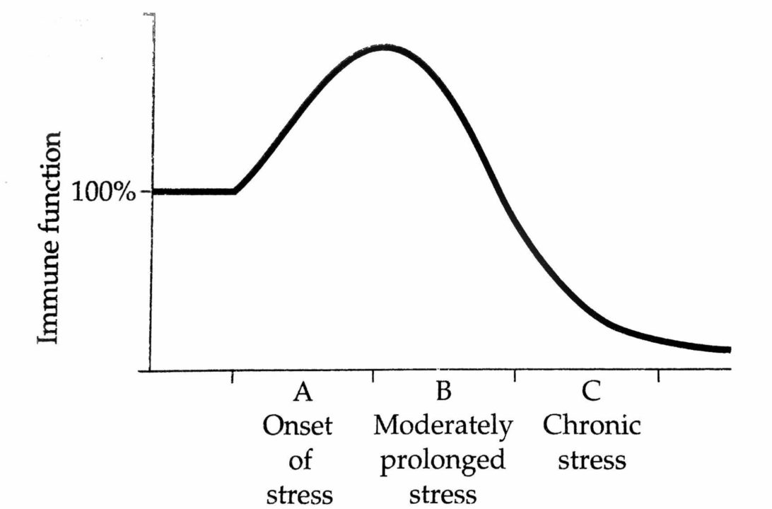 Il sistema immunitario è coinvolto nelle risposte di difesa da agenti patogeni che minacciano la salute dell’organismo. Il sistema immunitario e il sistema nervoso sono reciprocamente interconnessi e si influenzano a vicenda. Lo stress ha normalmente un effetto stimolante sull’attività immunitaria, ma in una situazione di stress acuto potrebbe verificarsi un’eccessiva risposta immunitaria. Tuttavia, nel medio e lungo periodo, corticosteroidi e catecolamine sopprimono l’attività immunitaria. Ma perché si riduce la difesa immunitaria durante lo stress cronico? Questo potrebbe essere un modo per mitigare l’attività del sistema, che di per sé, a causa dello stress, è già in uno stato di allerta. Inoltre, attivare il sistema immunitario è dispendioso a livello energetico. Troppa attivazione di tale sistema può anche portare a sviluppare malattie autoimmuni (ad esempio il Morbo di Crohn).