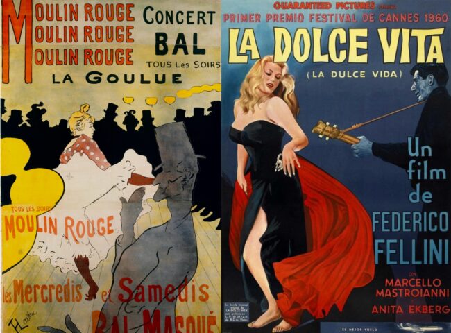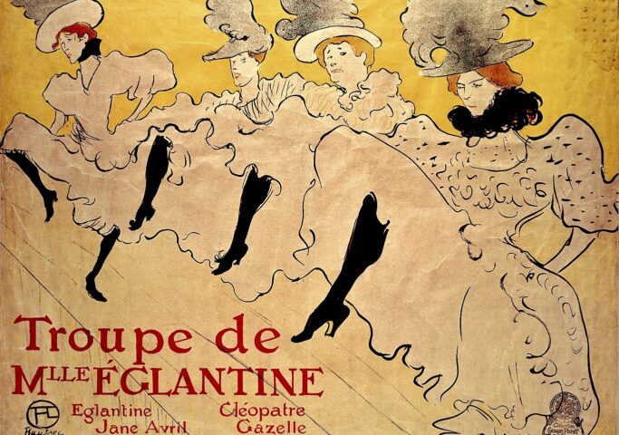 L’iconica locandina per lo spettacolo al Moulin Rouge del 1891, conduce subito lo spettatore dentro il manifesto “in medias res” (ovvero come se fosse già presente da molto tempo) sopratutto grazie al contrasto tra la figura della ballerina e il contesto corredato di macchie di luce gialla, l’impostazione insolita della scena con una figura in primo piano e alcune dietro che spezzano la composizione, il punto di vista perfettamente in linea con quello degli occhi di chi entra in una sala da ballo.