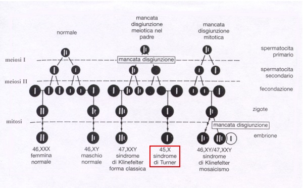 - Sindrome di Turner: gli individui affetti hanno solo un cromosoma del sesso, il cromosoma X e colpisce 1 su 10.000 femmine. Gli embrioni che sopravvivono manifestano alterazioni durante la pubertà, non sviluppando caratteri sessuali secondari. Hanno una statura inferiore alla media, mammelle poco sviluppate, organi sessuali immaturi e ridotta capacità di interpretare le relazioni spaziali.