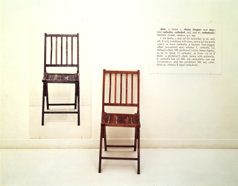 La nozione di cultura a cui si rifà Kosuth è decisamente appartenente ad un secondo Wittgenstein, autore delle Ricerche filosofiche, in cui si definisce l’essenza del linguaggio come imprescindibile dall’uso, ovvero dal suo impiego nei diversi contesti. Kosuth attinge da questo secondo aspetto del linguaggio, prendendo in esame il concetto collettivo di ‘arte’, nell’epoca dello sgretolamento delle ideologie. Parla di una crisi del significato : ‘quando la religione della scienza offre la propria povertà spirituale, la società prova il rischio di vivere alla deriva del significato’. Kosuth è convinto che l’arte sia generatrice di significati, e che trovi posto solo dopo la filosofia. Dinanzi all’inesprimibile l’arte trova la sua funzione: mostrare piuttosto che dire. Rapporta Arte e Linguaggio, ma essi trovano solo una comparazione con il filosofo, non pretendendo un’analogia. Ad essere messi in relazione da Wittgenstein, sono invece il linguaggio e il mondo, che si configurano secondo un essenziale isomorfismo, tale che per comprendere il mondo è possibile partire dalla comprensione del linguaggio, in quanto riflesso del primo e viceversa. Questo significa che ogni proposizione sensata che utilizziamo, è anche un’immagine logica dei fatti, necessariamente composita di una precisa relazione fra oggetti. Nel pensiero di Kosuth la proposizione artistica si realizza all’interno di una rete di relazioni, intessute senza alcun fine referenziale: In One and Three Chairs affianca una sedia reale ad una sua fotografia e ad una definizione visiva della stessa. I singoli elementi non hanno rilevanza considerati in sé come oggetti, non si cerca un corrispettivo nella realtà. Ma importa il legame che si instaura fra i vari elementi, che da vita ad un livello successivo di senso.